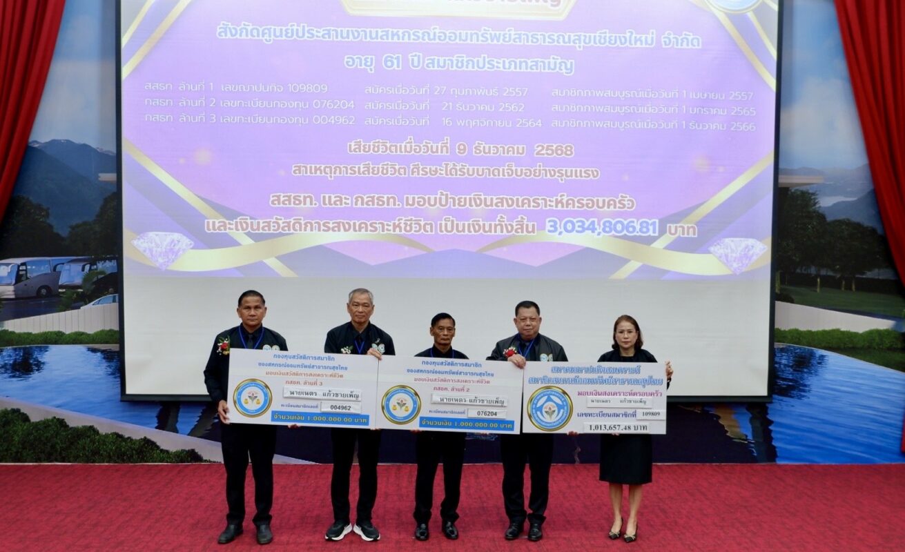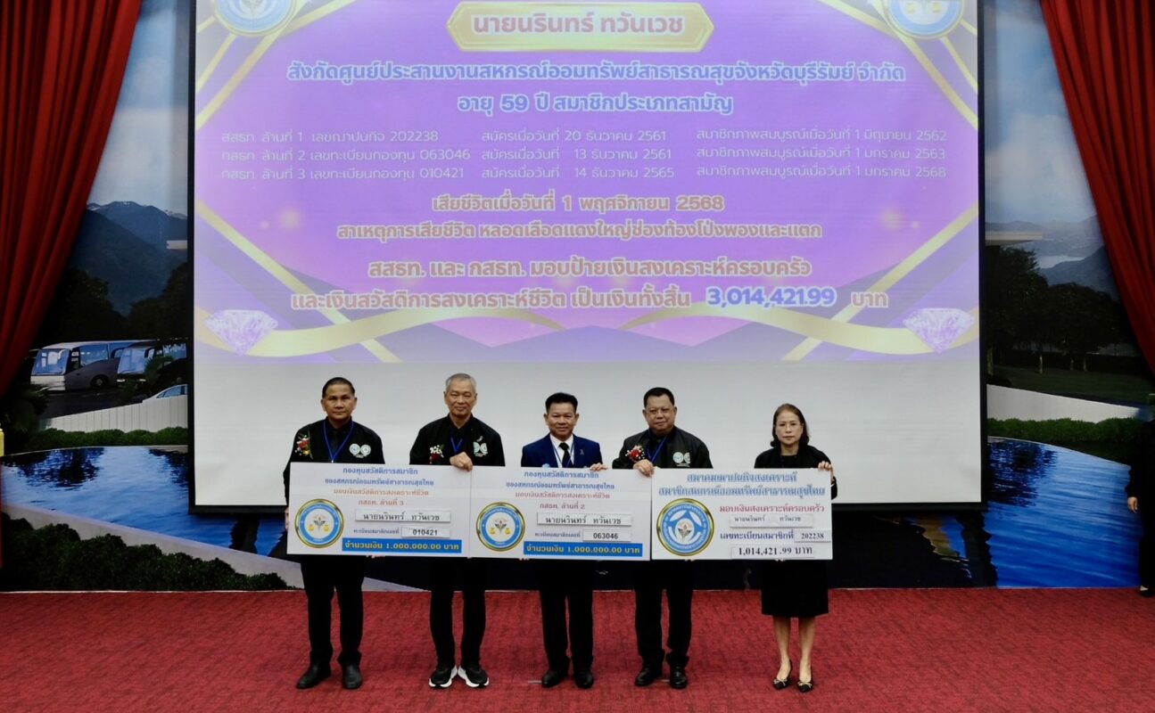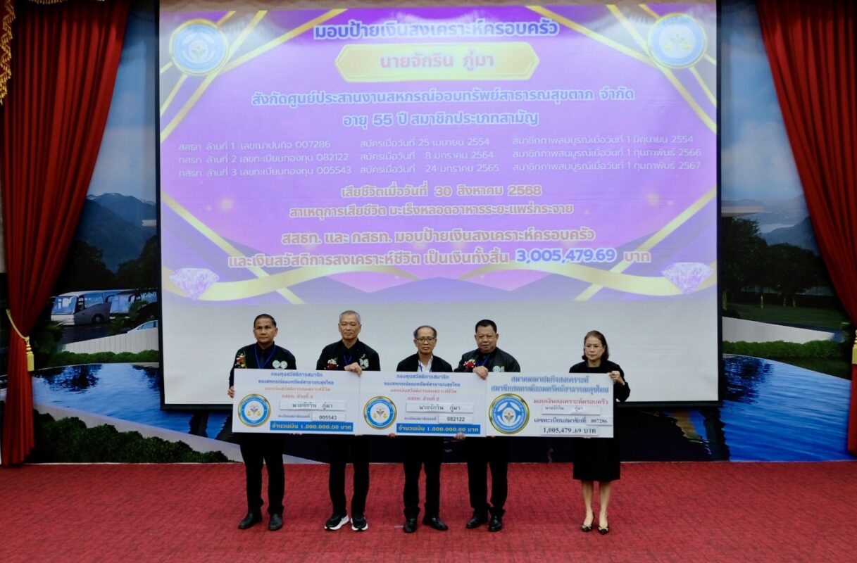 จากนั้นได้มีการมอบป้ายเงินสงเคราะห์ครอบครัว สสธท. ล้านที่ 1 กสธท. ล้านที่ 2 และ กสธท. ล้านที่ 3 ให้กับผู้แทนรับมอบป้าย จำนวน 3 ราย รวมเป็นเงินทั้งสิ้น 9,054,708.49 บาท พร้อมด้วยการมอบโล่รางวัลให้กับศูนย์ประสานงานดีเด่น ประธานกรรมการ ผู้จัดการ และเจ้าหน้าที่ศูนย์ประสานงานดีเด่น ประจำปี 2568 จำนวน 21 รางวัล