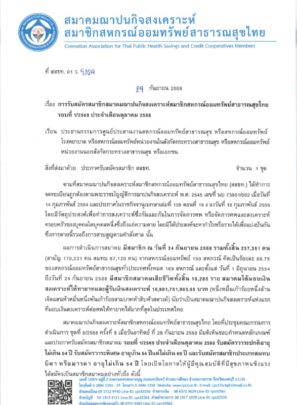 ข่าวประชาสัมพันธ์กำหนดเรียกเก็บเงินสงเคราะห์ล่วงหน้า(ที่คาดว่าจะมีสมาชิกเสียชีวิต) และเงินบำรุงรายปี รวมถึงเงินสงเคราะห์ล่วงหน้าที่ไม่พอจ่าย ประจำปี 2569 Posted on September 10, 2025September 12, 2025 by admin1CPCT 10 Sep Continue reading →